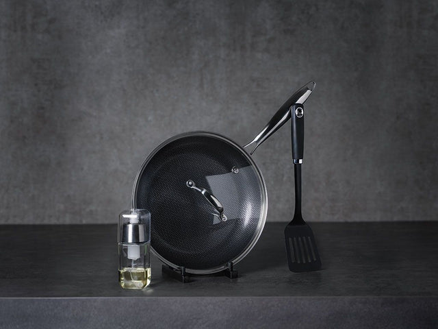 ONYX COOKWARE™ kattiloiden ja pannujen erityispiirre on epäilemättä kyky käyttää metallivälineitä ilman riskiä, että non-stick-pinnoite naarmuuntuu tai muuten vaurioituu. Tämä ei ole vitsi! Käytä metallista lastaa, haarukoita, lusikoita – kyllä, voit jopa leikata lihaa suoraan ONYX COOKWARE™ kattiloissa ja pannuissa! Ainutlaatuinen patentoitu hybriditeknologiamme varmistaa, että voit käyttää metallivälineitä ilman pelkoa pinnoitteen vahingoittumisesta.
