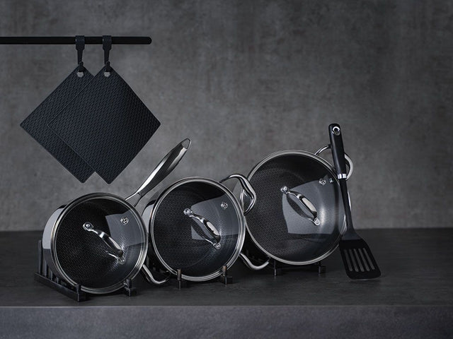 ONYX COOKWARE™ KATTILAT ovat täydellinen yhdistelmä toiminnallisuutta, yksinkertaisuutta sekä ensiluokkaisia materiaaleja ja laatua. Kaikki kattilamme ja kastikekattilamme on valmistettu korkealaatuisella keraamisella non-stick-pinnoitteellamme, joka on vahvistettu timanttipölyllä lisälujuuden ja kestävyyden takaamiseksi. Tämä pinnoite tarjoaa äärimmäistä kestävyyttä sekä täydellisen ruskistuksen lihalle ja vihanneksille, ja antaa samalla erinomaisen tarttumattomuuden, jonka odotat korkealaatuiselta non-stick-keittiövälineeltä. ONYX COOKWARE™ -kattiloiden ainutlaatuinen kolmen kerroksen rakenne, jossa keskellä on alumiinia, takaa tasaisen lämmön jakautumisen. Lisäksi se tarkoittaa, että astiamme kuumenee paljon nopeammin kuin tavalliset ruostumattomasta teräksestä, valuraudasta tai vastaavista materiaaleista valmistetut tuotteet.