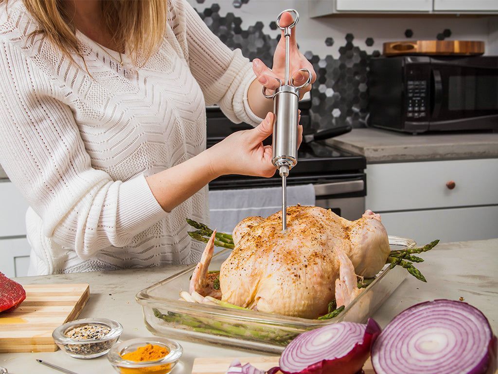 ONYX COOKWARE™ MARINADIRUISKUTIN on valmistettu korkealaatuisesta ruostumattomasta teräksestä, joka varmistaa pitkäikäisyyden ja luotettavan suorituskyvyn. Ruiskun vahva rakenne ja liikuteltavat osat tekevät paksujen marinadien injektoinnista vaivatonta. Stanttiputki liikkuu tasaisesti ja toimii parhaiten, kun siihen lisätään ajoittain vähän ruokaöljyä.