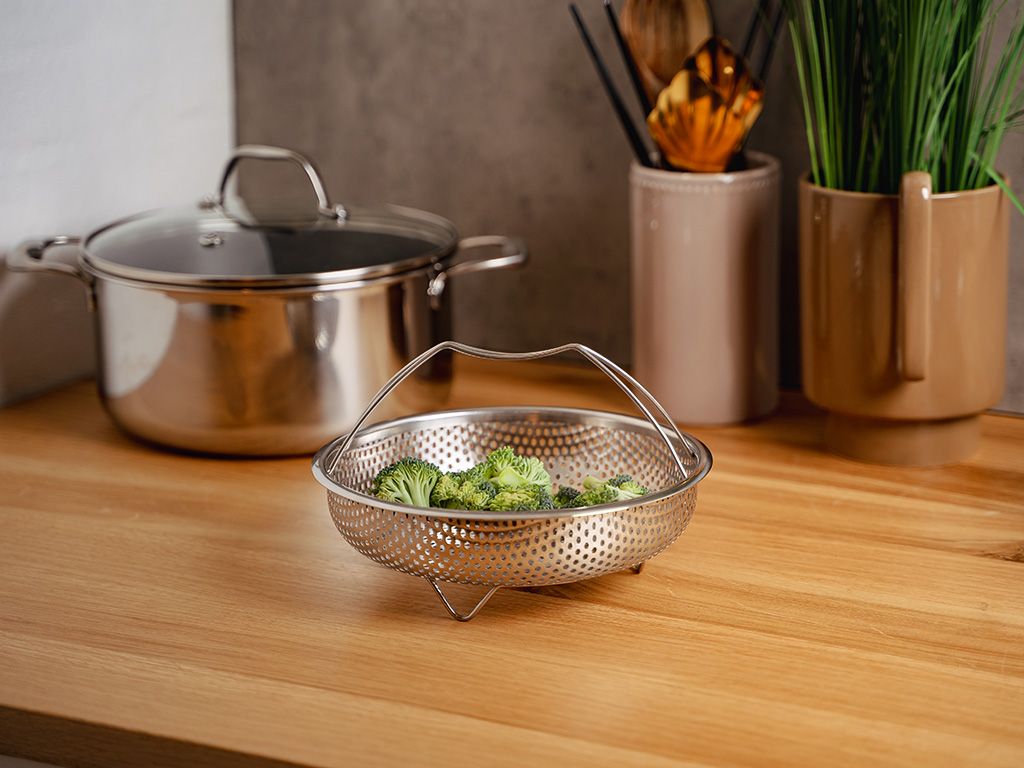 Pohjan pienet reiät jakavat höyryn tasaisesti, jotta kaikki kypsyy lempeästi ja tarkasti – ilman että maku tai muoto kärsii.Aseta höyrytyskori kattilaan tai pannuun, lisää vähän vettä, lisää raaka-aineet ja peitä kannella – näin höyry jää sisään. Taitettava kahva helpottaa nostamista ja tekee säilytyksestä vaivatonta. Olipa kyseessä nopea arkiruoka tai perheillallinen, ONYX COOKWARE™ -HÖYRYTYSKORI tarjoaa terveellisiä tuloksia ilman vaivaa.