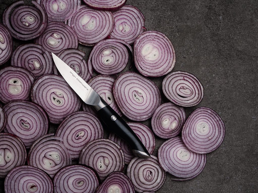 Joskus isompi veitsi, kuten kokkiveitsi tai apuveitsi, on liian suuri tekemään tarkkuutta vaativia töitä. Tässä kohtaa ONYX COOKWARE™ -kuorimaveitsi tulee tarpeeseen - kevyt veitsi, jota voi pitää kädessä, voi tehdä suuren eron.