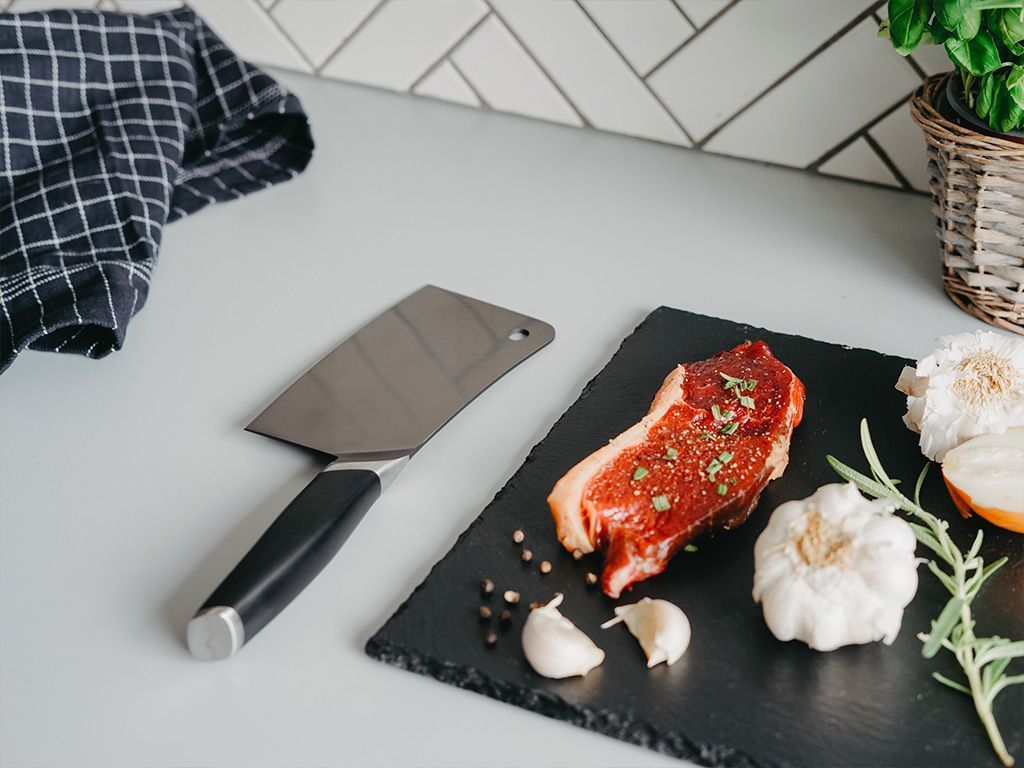 ONYX COOKWARE™ LIHAKIRVES on suunniteltu mukavuuden ja helpon hallittavuuden takaamiseksi ergonomisen kahvansa ansiosta, mikä tarkoittaa, että voit pilkkoa vihanneksia ja lihaa tuntikausia ilman epämukavuutta!
