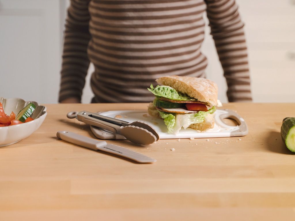 Tämä monipuolinen setti tekee kokkaamisesta jännittävän perheseikkailun. Lapsille turvallisten veitsien, aaltomuotoisen leikkurin, kuorijan, pihdien ja tukevan, liukumattoman leikkuulaudan ansiosta pikku kokit voivat oppia keittiötaitoja itsevarmasti ja turvallisesti. Veitset ovat tarpeeksi teräviä leikkaamaan lihaa, hedelmiä ja vihanneksia, mutta eivät niin teräviä, että ne voisivat viiltää sormia, mikä tekee niistä paljon turvallisemmat kuin perinteiset veitset.